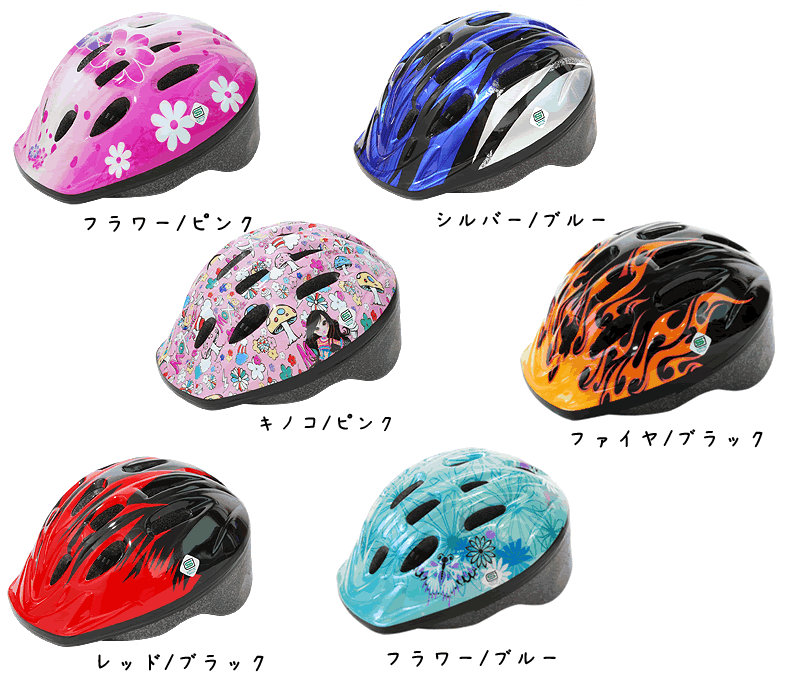 デザイン フラワー/ピンク キノコ/ピンク レッド/ブラック シルバー/ブルー ファイヤ/ブラック フラワー/ブルー 女の子にも男の子にもよく似合うおしゃれでかわいいデザインのヘルメットです。