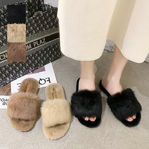サンダル フラット ファー ラビットファー レディース ぺたんこ ペタンコ バブーシュ スリッパ 靴 婦人靴 ブラック ブラウン カーキー 黒 茶色
